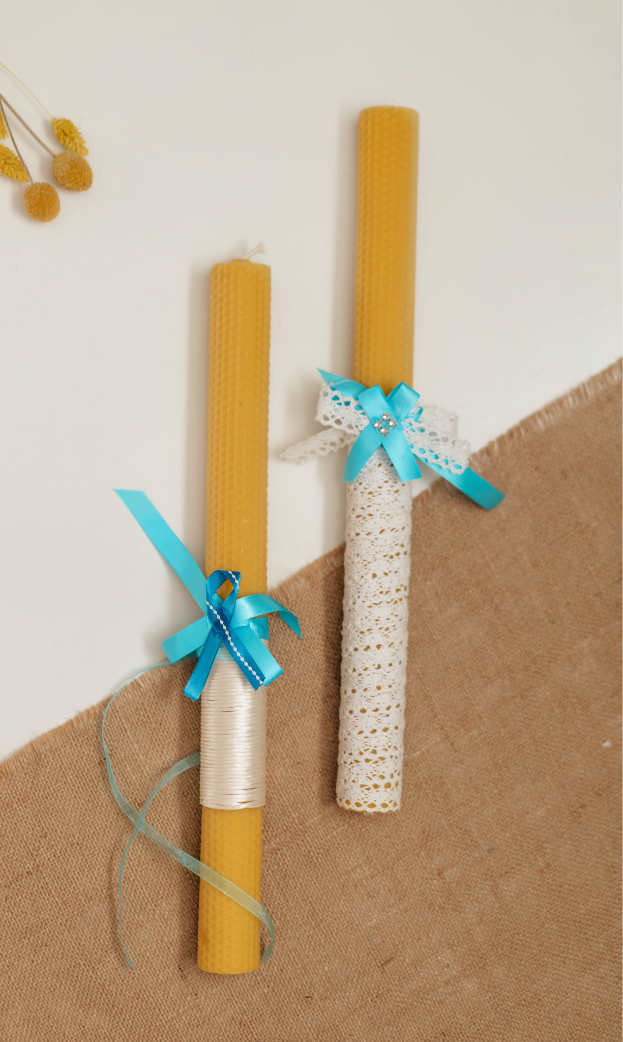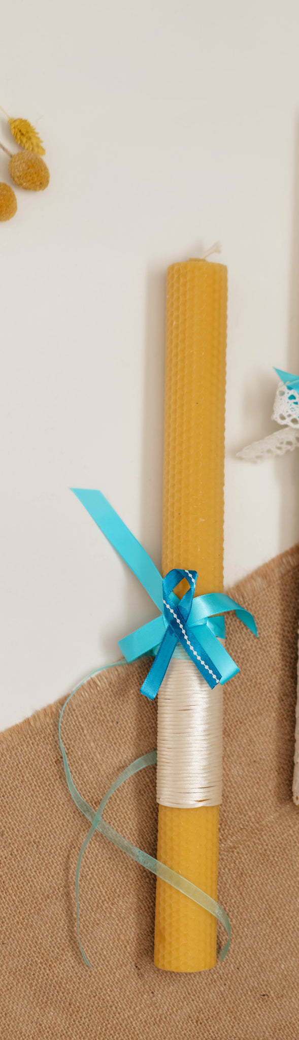 Bougie  de baptême "Ploutos ( en grecque Πλοῦτος / Ploûtos qui signifie  richesse, y compris agraire" ) bougie de baptême en cire d'abeille qui pèse 0.250 g). avec ruban en dentelle et fil écru. Longueur: 41 cm et épaisseur de 3cm.
