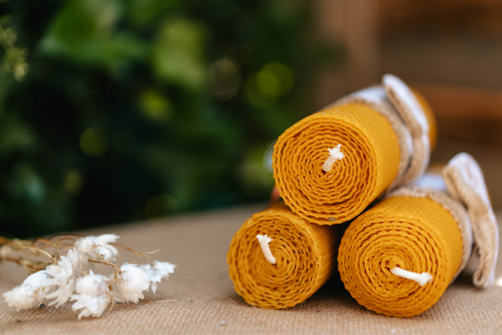 Bougies entièrement faites main en cire d'abeille naturelle. Le coffret est composé de 2 grandes et 1 petite bougie.