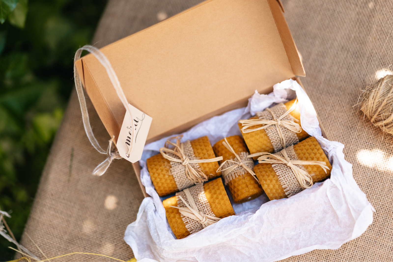 Coffret de bougies " Les Nymphes"(du grec ancien νύμφη / nýmphē« jeune fille »)-bougies entièrement faites main en cire d'abeille naturelle. Le coffret est composé de 5 mini-bougies avec décoration en toile de jute et fil de raphia naturel. Hauteur : 8 centimètres, Largeur : 5 centimètres