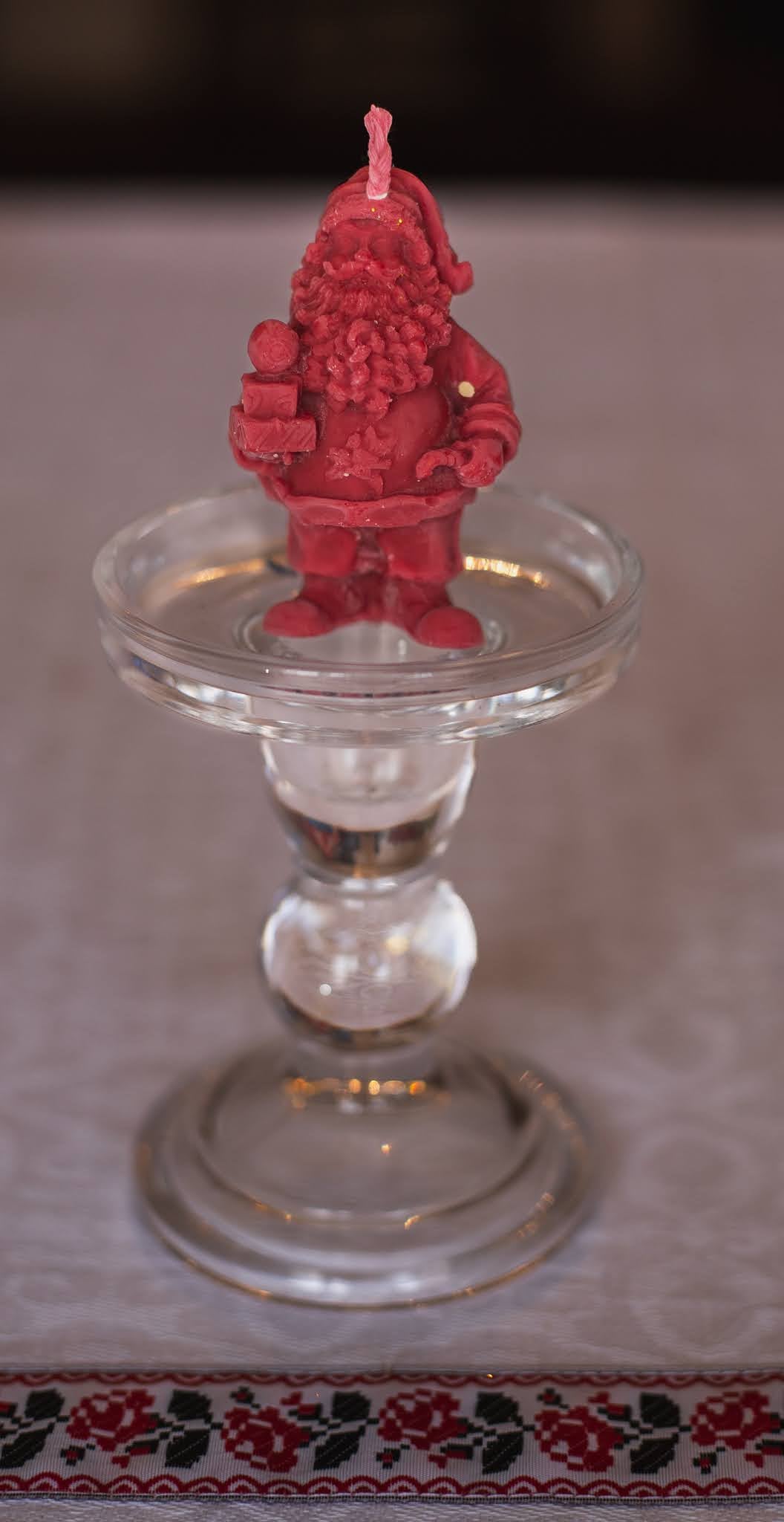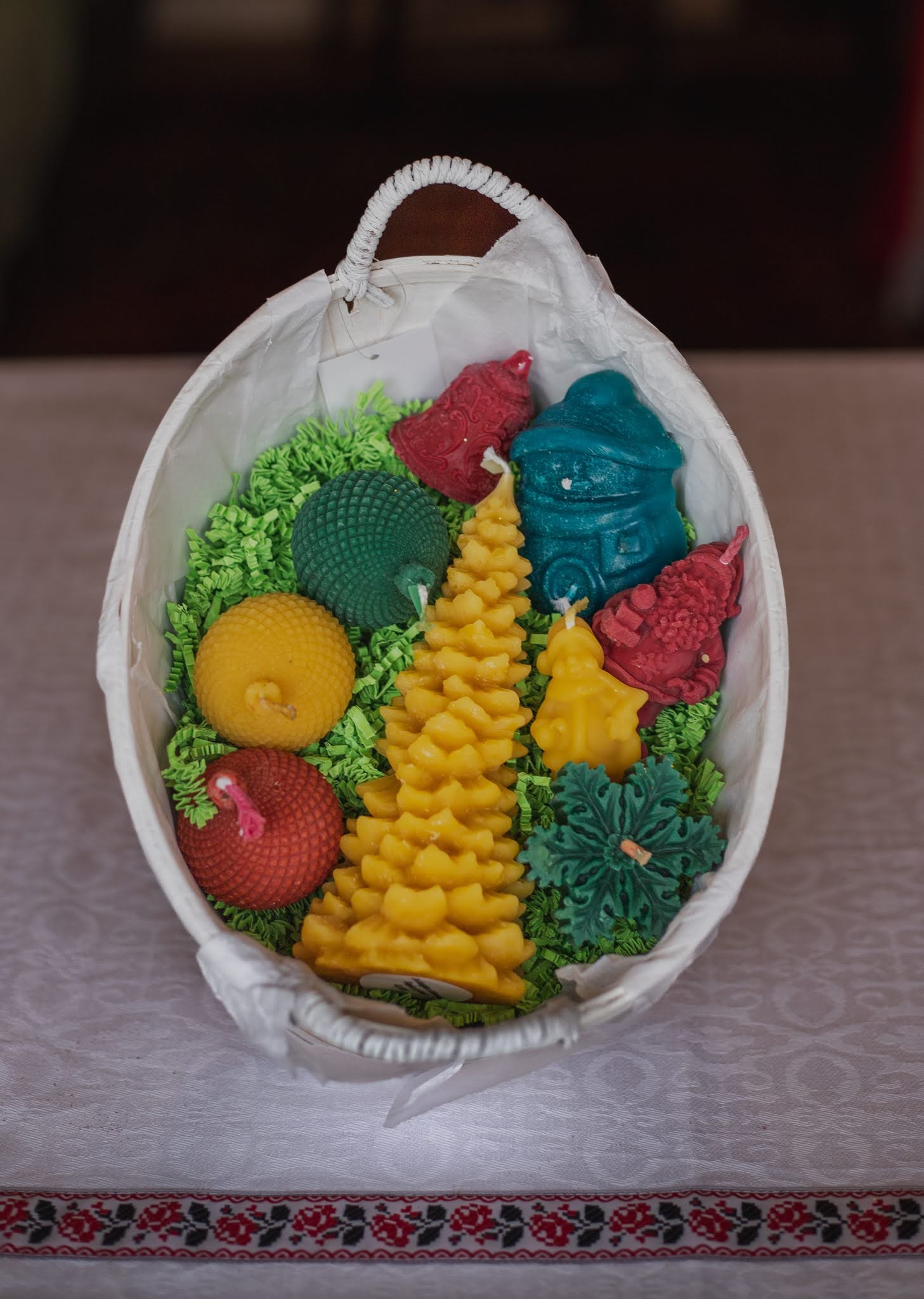 Coffret de Noel composé des Bougies en cire d'abeille naturelle avec 1 sapin 1 père Noel grand 1 père Noel petit 3 boules de noël rouge, verte, jaune, 1 cloche rouge 1 bonhomme de neige bleuet 1 flocon de neige vert.