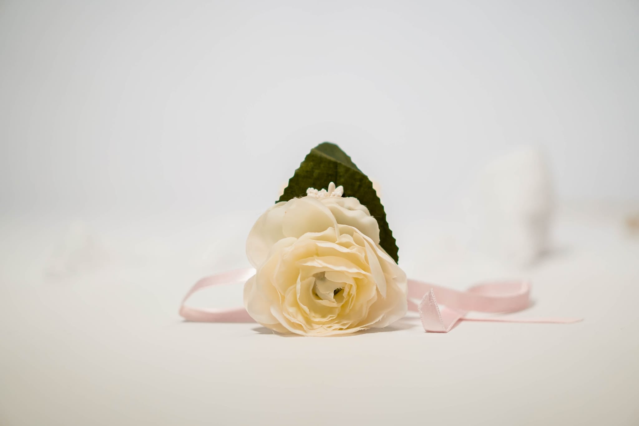 Boutonnière poignet pour femme avec fleurs artificielles blanches et ruban en satin rose.